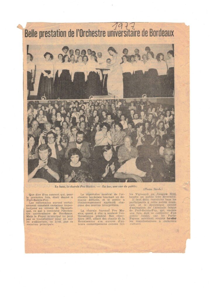 Lire l'articleIl y a soixante ans, en 1966, Guy Chaumont, pharmacien, et un petit groupe d’amis, amateurs éclairés et épris de musique classique, fondèrent l’ensemble choral Pro Musica à Sainte Foy La Grande.
